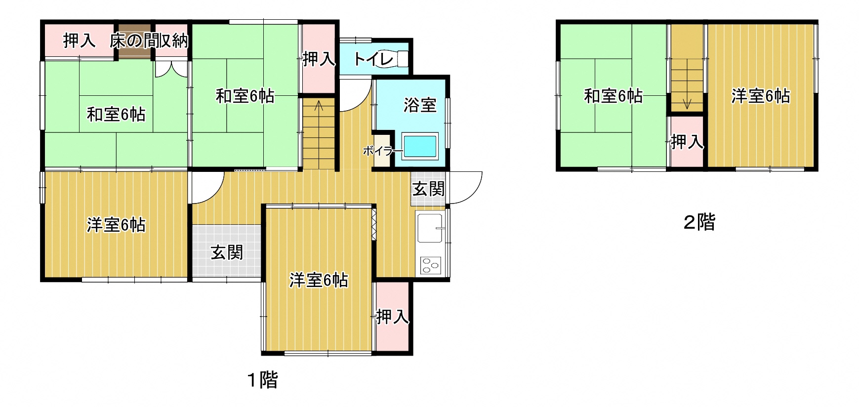 詳細間取り 1階:居間6畳、和室6畳、6畳、洋室6畳、台所、風呂、トイレ
