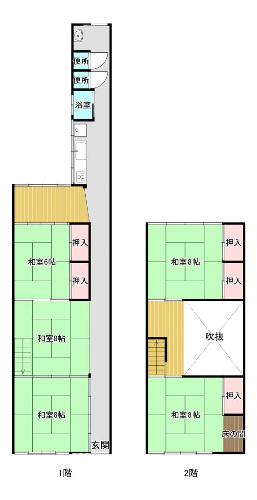 1階:和室8畳、8畳、6畳、台所、風呂、トイレ 2階:和室8畳、8畳 |