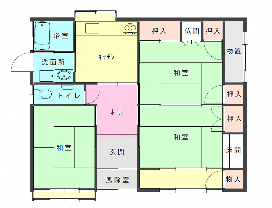 | 詳細間取り | 1階:和室6畳、6畳、6畳、台所、風呂、トイレ、物置 |