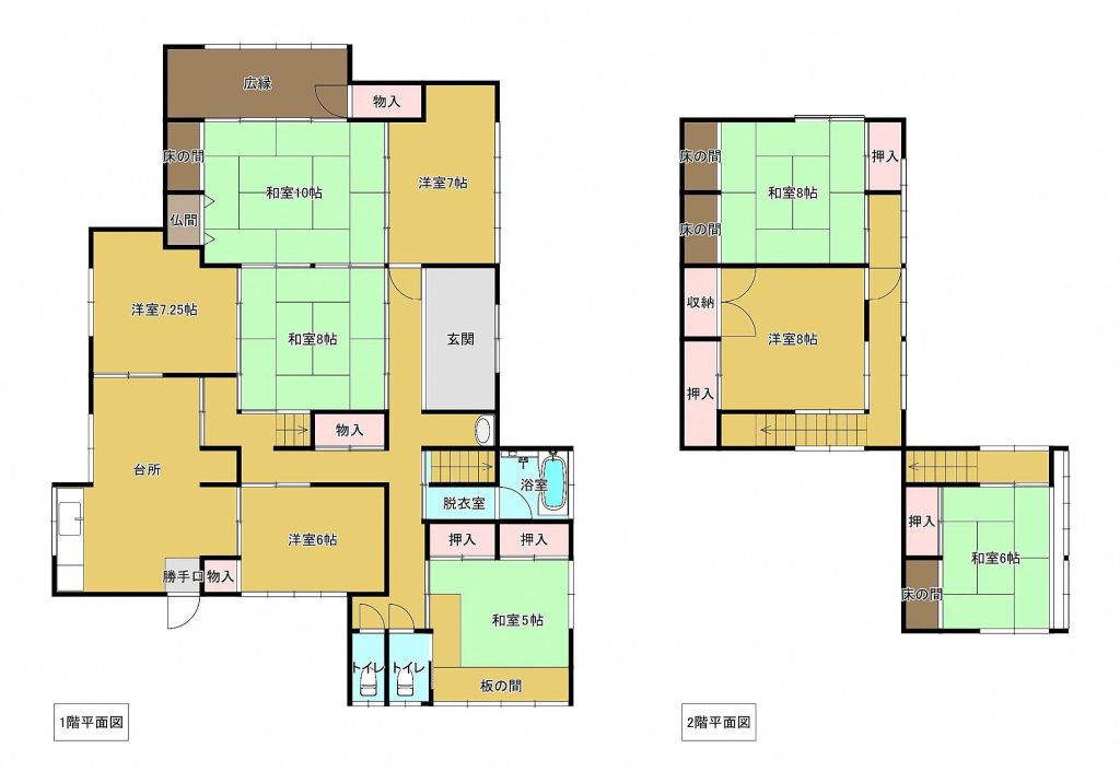 1階:和室10畳、8畳、5畳、洋室7.25畳、7畳、6畳、台所、風呂、トイレ 2階:和室8畳、6畳、洋室8畳 |
