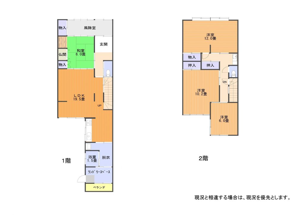 1階:和室6畳、台所、風呂、トイレ 2階:洋室6畳、10.2畳、12畳、トイレ |